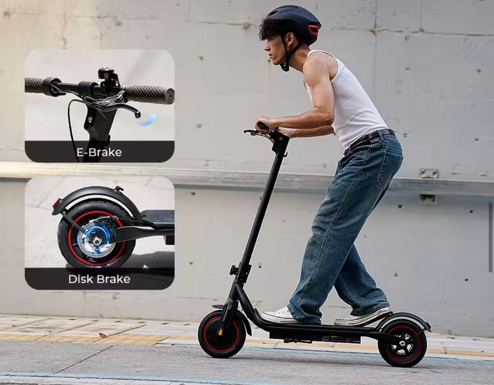 El patinete está equipado con un sistema de frenos de disco de alto rendimiento, diseñado para ofrecer una frenada rápida, estable y segura en cualquier situación. Gracias a su tecnología de frenado eléctrico asistido, la respuesta es inmediata